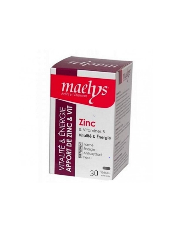 MAELYS ZINC 30 COMPRIMESDESCRIPTION: Maelys est une levure sèche désactivée ou du zinc physiologiquement disponible est adjoint.Le produit procure nutritionnel de la levure (protéines de hautes qualité  vitamines et minéraux  un minéral qui agit positivement sur la fertilité et la reproduction la fonction immunitaire  le métabolisme acido basique  la synthèse d’ADN et la division cellulaire l’entretien des os  la fonction cognitive .      Maintien de la peau      Teint terne      Problèmes de peau      Fatigue et perte de tonus      Ongles déminéralisées.AntioxydantLe zinc est un oligoélément essentiel aux propriétés anti-oxydantes, qui joue un rôle indispensable dans un grand nombre de fonctions physiologiques.UTILISATION:1 à 2 gélules par jours à prendre le matin de préférence.Avant le repas  avec un grand verre d’eau.Durée de complémentation / 3 mois. COMPOSITION:par gélule en mgZinc 7.5mgVIT B1 0.11VIT B2 0.02VIT B5 0.33VIT B6 0.03VIT B9 0.01